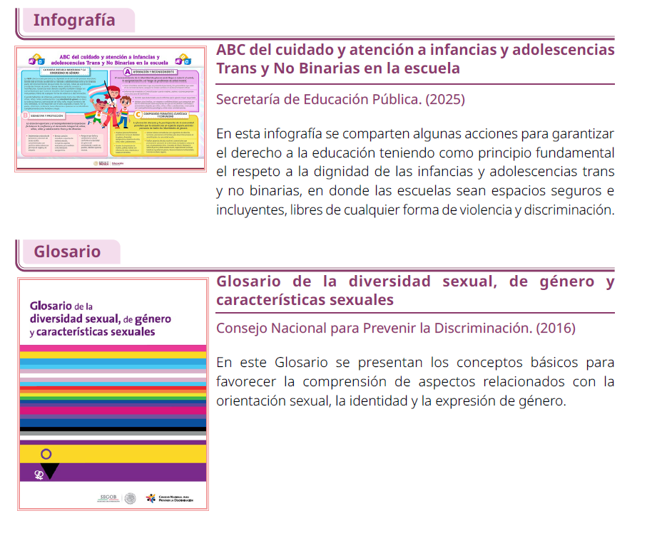 El documento dirige a los maestros hacia una serie de materiales elaborados por CONAPRED, Canal Once y asociaciones transgénero.